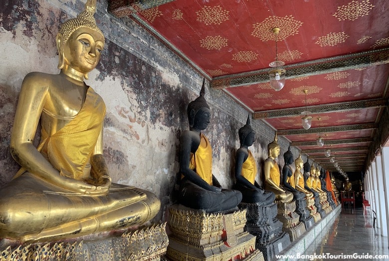 In the ordination hall, decorated with detailed murals, are statues of dozens of monks facing the Buddha. Outside is the Giant Swing, built in 1784 for ceremonies honoring the Hindu creator god.
